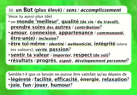 The backside of each card offers another way to listen to deepen your understanding and thereby listen to your needs at a deeper level. Which words are for you connected to your need 'a (higher) Purpose' and/or 'meaning'? Do the needs on the backside offer more clarity, why you picked your needs card and/or what the words on this card mean to you?