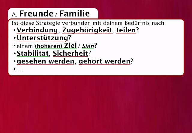 Die Rückseite jeder Karte bietet eine Möglichkeit die Bedürfnisse hinter diese Strategie zu finden. Welche Bedürfnisse erfüllt diese Strategie in diesem Moment? Welche Bedürfnisse werden nicht ausreichend erfüllt? Vielleicht ist es angenehm, dass Freunde / Familie Dein Bedürfnis nach Zugehörigkeit erfüllen. Vielleicht ist es gleichzeitig weniger angenehm, dass Freunde / Familie einige Punkte / Themen, die für Dich wichtig sind, scheinbar nicht hören und sehen (wollen). Welches Bedürfnis möchte gefunden und gehört werden?