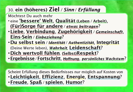 Die Rückseite jeder Karte bietet eine weitere Möglichkeit, Dein Verständnis zu vertiefen und damit dein Bedürfnis zu zu hören. Welche Worten sind für Dich verbunden mit Dein Bedürfnis nach 'ein (höheres) Ziel' und/oder 'Sinn / Erfüllung'? Geben die Bedürfnisse auf der Rückseite mehr Klarheit, weshalb Du Deine Bedürfniskarte gewählt hast und/oder was die Worten auf diese Karte für Dich bedeuten?