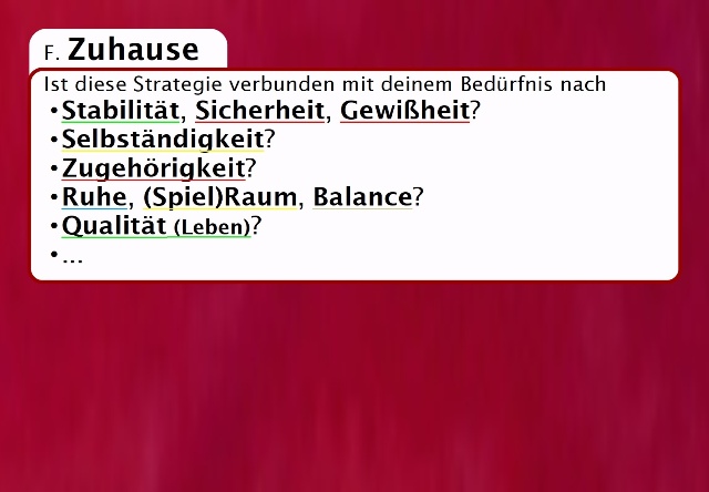 Die Rückseite jeder Karte bietet eine Möglichkeit die Bedürfnisse hinter diese Strategie zu finden. Welche Bedürfnisse erfüllt diese Strategie in diesem Moment? Welche Bedürfnisse werden nicht ausreichend erfüllt? Vielleicht ist es angenehm, dass Dein Zuhause Dir Stabilität bietet. Vielleicht ist es gleichzeitig weniger angenehm, dass Dein Zuhause nicht die Lebensqualität bietet, die Du gerne erreichen würdest. Welches Bedürfnis möchte gefunden und gehört werden?