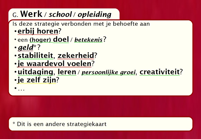 De achterkant van iedere strategiekaart biedt de mogelijkheid om de behoeften achter die strategie te vinden. Welke behoeften vervult deze strategie op dit moment? Welke behoeften worden onvoldoende vervuld? Misschien is het aangenaam dat thuis je werk jou financiële zekerheid biedt. Misschien is het tegelijkertijd minder aangenaam, dat je denkt op je werk onvoldoende de persoon te kunnen zijn, die je graag wilt zijn. Welke behoefte wil gevonden en gehoord worden?