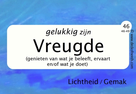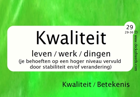 Wat wil je werkelijk? Wat willen anderen werkelijk? Wat zijn de behoeften achter je wensen en de wensen van anderen? Het Deck of Needs is een verzameling kaarten (deck), die je ondersteunt om snel en gemakkelijk de 'juiste' woorden te vinden voor behoeften EN je begrip te verdiepen EN om gemakkelijk meer behoeften te vinden, als dat nodig is. Wij denken dat het een krachtige tool is voor professionele luisteraars (trainers, coaches, leerkrachten, mediators, therapeuten enz.) en alle andere mensen, die hun communicatie verbeteren willen of anderen daarbij willen ondersteunen.